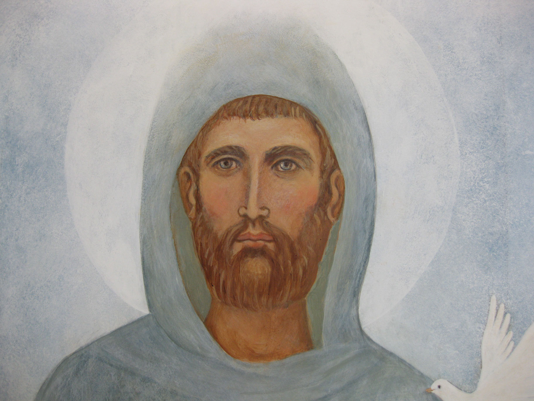 Nueva represeantación de San Francisco con palomas, según el fresco que se encuentra en monasterio benedictino de Sacro Speco, Subiaco, Italia. La tradición cuenta que Francisco habría visitado el lugar como peregrino antes de su canonización, y el pintor que entonces realizaba el fresco de San Gregorio, lo habría retratado en esta capilla, siendo la imagen más antigua de San Francisco…